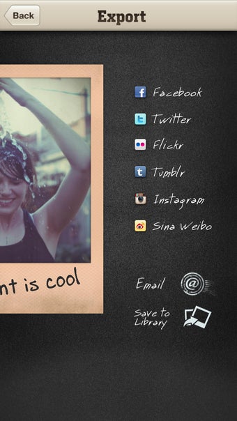 Lo mejor es que Instant: The Polaroid Instant Camera funciona para realizar fotografías directamente con un filtro o para editar fotografías que tengas guardadas en tu dispositivo. Los resultados son idénticos a las fotografías tomadas con una Polaroid. La aplicación tiene 30 filtros diferentes que puedes ajustar cambiando sus valores como intensidad o contraste. Encontrarás la opción de agregar texto gracias a las 10 fuentes de texto a mano alzada que incluye la aplicación. Por supuesto, la principal característica de Instant: The Polaroid Instant Camera es agregar el característico borde blanco de Polaroid, ahora disponible en 26 colores diferentes. Puedes compartir tus imágenes favoritas por Email, Facebook, Twitter, Flickr, Tumblr, Instagram y Sina Weibo.